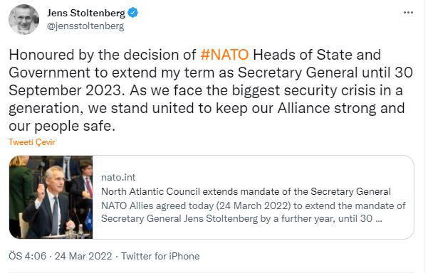 Açıklamada, “NATO müttefikleri bugün (24 Mart 2022), Genel Sekreter Jens Stoltenberg’in görev süresini 30 Eylül 2023’e kadar bir yıl daha uzatmayı kabul etti. Müttefikler, özellikle uluslararası güvenlik açısından bu kritik zamanda, liderliği ve bağlılığı için Genel Sekretere teşekkür ettiler” denildi.