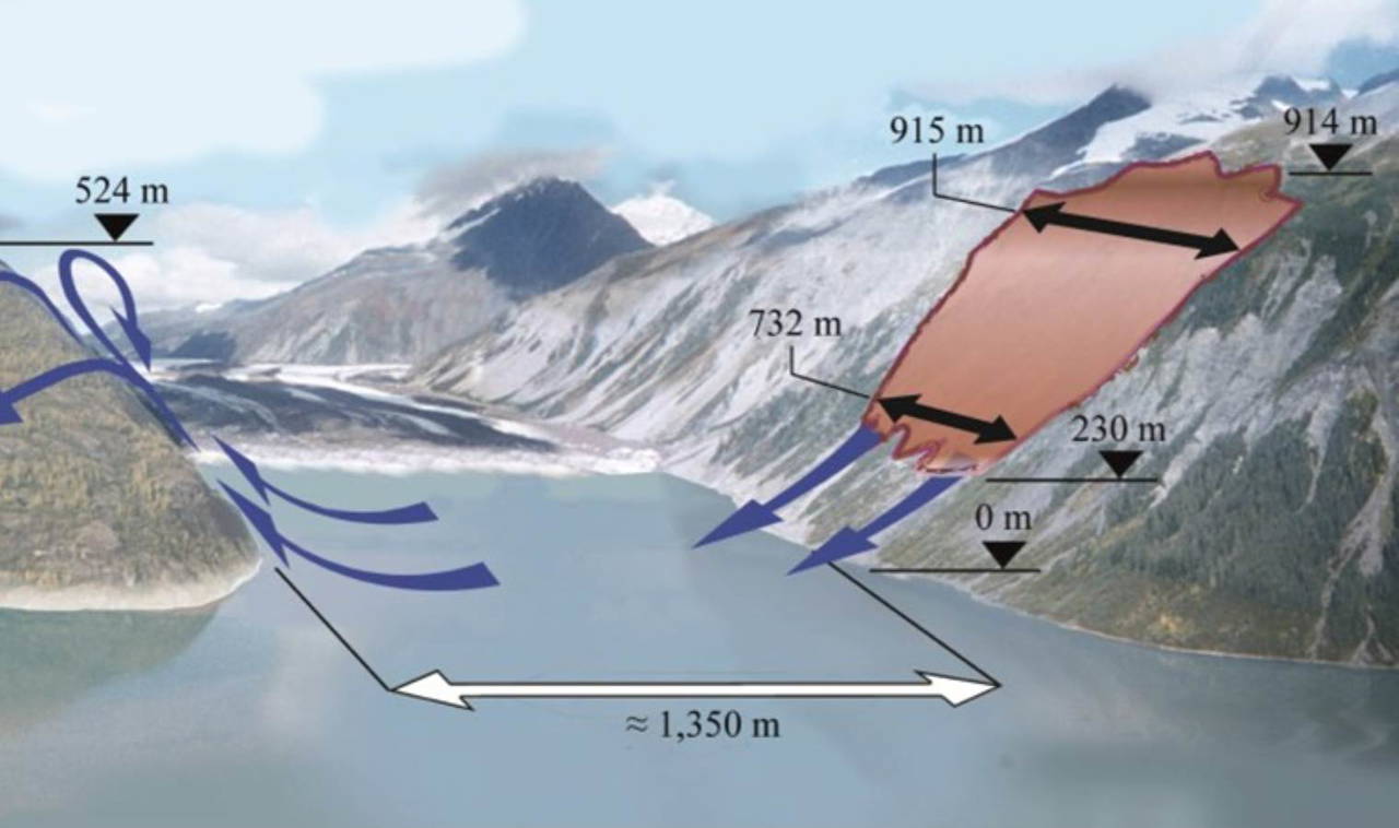 7.8 şiddetindeki deprem, çevredeki araziyi sarsarken, yaklaşık 730 x 915 x 90 metre boyutlarındaki bir kaya parçasını da uçurumun tepesinden kopararak 600 metre aşağıdaki körfeze yuvarladı.