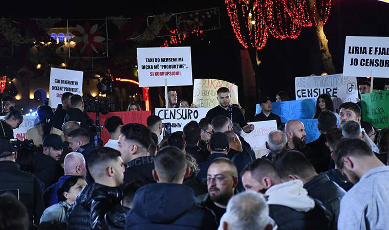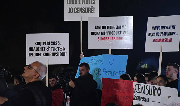 "İfade özgürlüğünün savunulması" sloganıyla düzenlenen protestoda göstericiler, "İfade özgürlüğü, sansüre hayır", "Arnavutluk'ta 2025 yılında TikTok erişime kapatıldı", "TikTok'u da göç ettirdiniz" yazılı pankartlar taşıdı.