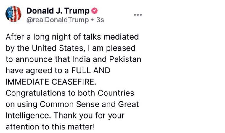 Trump, Truth Social'da yaptığı paylaşımda şu ifadelere yer verdi:"ABD'nin arabuluculuğunda uzun süren bir gecelik müzakerelerin ardından, Hindistan ve Pakistan’ın TAM VE ACİL BİR ATEŞKES konusunda anlaşmaya vardığını duyurmaktan memnuniyet duyuyorum. Akılcı davranıp sağduyu ve büyük bir zekâ sergiledikleri için her iki ülkeyi de tebrik ediyorum."