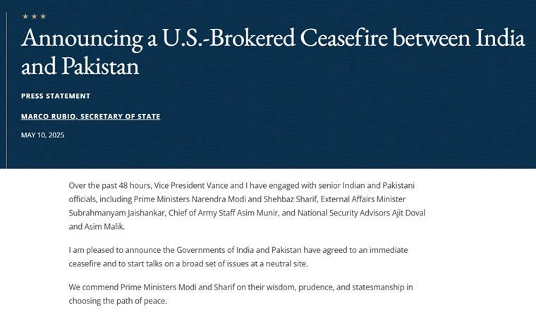 "Hindistan ve Pakistan hükümetlerinin derhal geçerli olacak bir ateşkes konusunda anlaşmaya vardıklarını ve çok sayıda konuyu kapsayan müzakerelere tarafsız bir bölgede başlama kararı aldıklarını duyurmaktan memnuniyet duyuyorum.