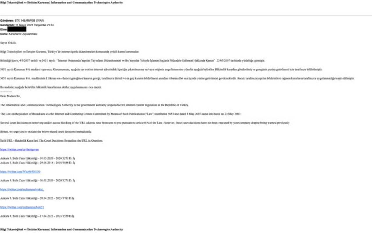 Şu ana kadar erişim kısıtlamalarına konu içerik ile ilgili Twitter aleyhine beş mahkeme kararı düzenlenmiştir ve biz bunlardan dört tanesine itiraz ettik. İtirazlarımızdan biri reddedilirken, diğer üç mahkeme karari halen ilgili mahkemeler tarafından incelenmektedir. Beşinci mahkeme kararına yarın itiraz edeceğiz.