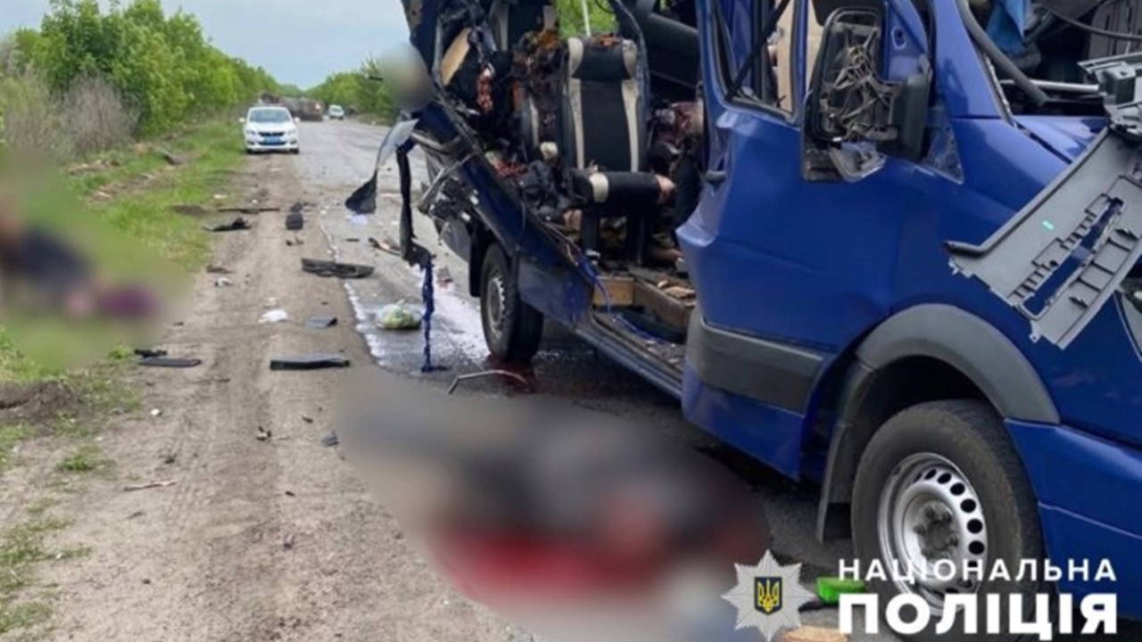Ukrayna polisi, olay yerinde bir yolcu minibüsünün tavanının kopmuş ve camlarının paramparça olduğu fotoğrafları yayımladı.