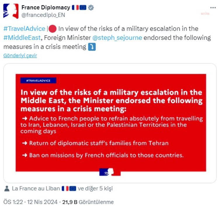 Fransa Dışişleri Bakanı Stephane Sejourne, Orta Doğu'daki duruma ilişkin gerçekleştirilen toplantıda, İran'daki Fransız diplomatların aile üyelerinin tahliye edilmesi talimatını verdi. Bakanlığın resmi X hesabı üzerinden yapılan paylaşımda da Fransız devlet memurlarının İran, Lübnan, İsrail ve Filistin topraklarında herhangi bir görev icra etmelerinin yasaklandığı ve vatandaşlara seyahat etmemelerinin tavsiye edildiği duyuruldu.