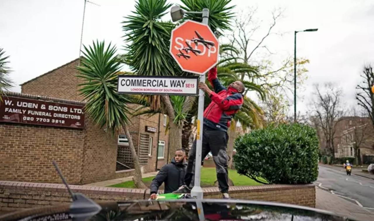 Banksy'nin sosyal medya paylaşımıyla kendisinin yaptığını doğruladığı eserinde, "DUR" trafik levhasının üzerinde insansız hava araçları görülüyordu. Ancak eser, Banksy'nin paylaşımından saatler sonra çalındı.