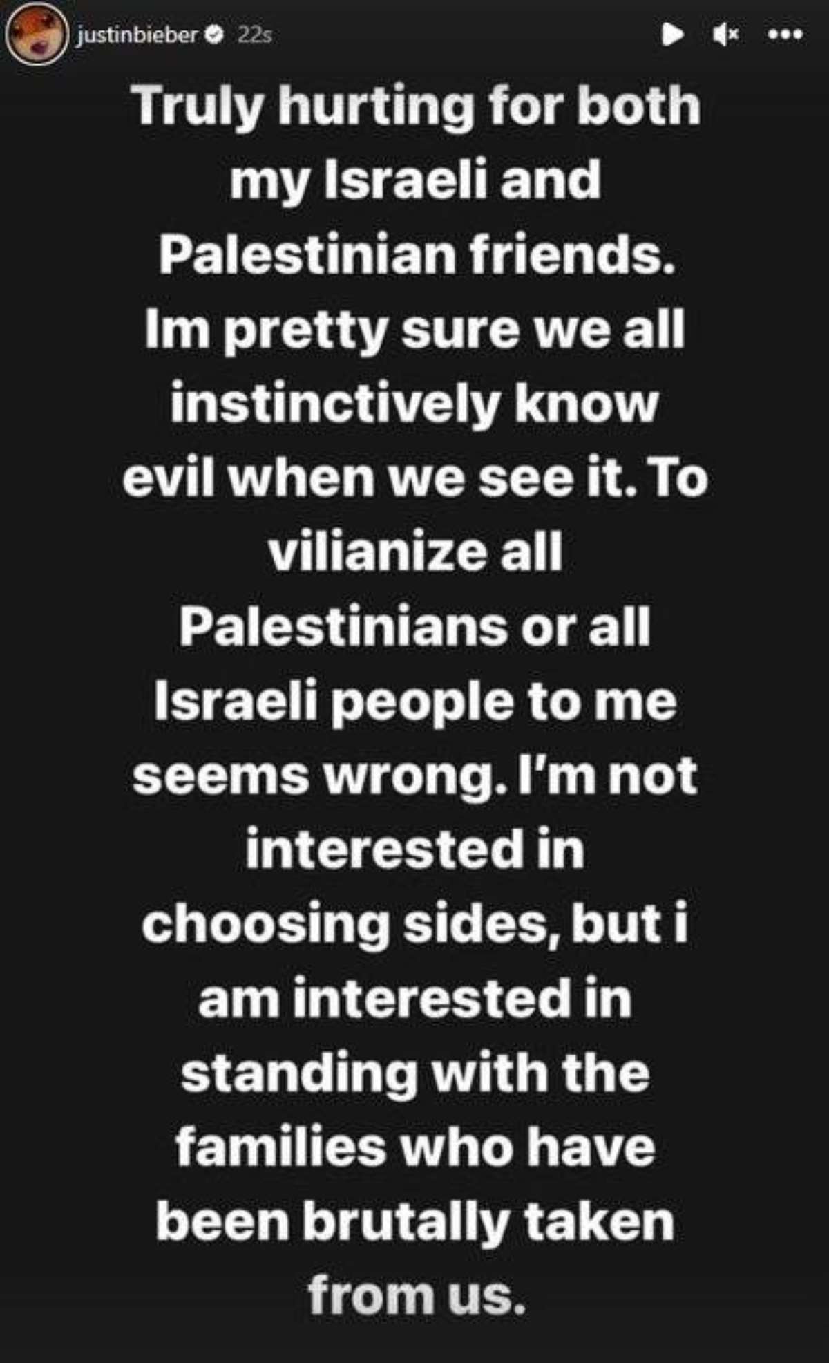 Bieber, "İsrailli ve Filistinli arkadaşlarım için gerçekten çok üzgünüm. Gerçekten iç güdüsel olarak gördüğümüzde kötülüğü fark ediyoruz. Filistinli ve İsraillileri kötü göstermek bence çok yanlış. Ben bir taraf seçme ile ilgili değilim, benim ilgilendiğim şey hayatları bizden alınan ailelerin yanında olmak" ifadelerini kullandı.