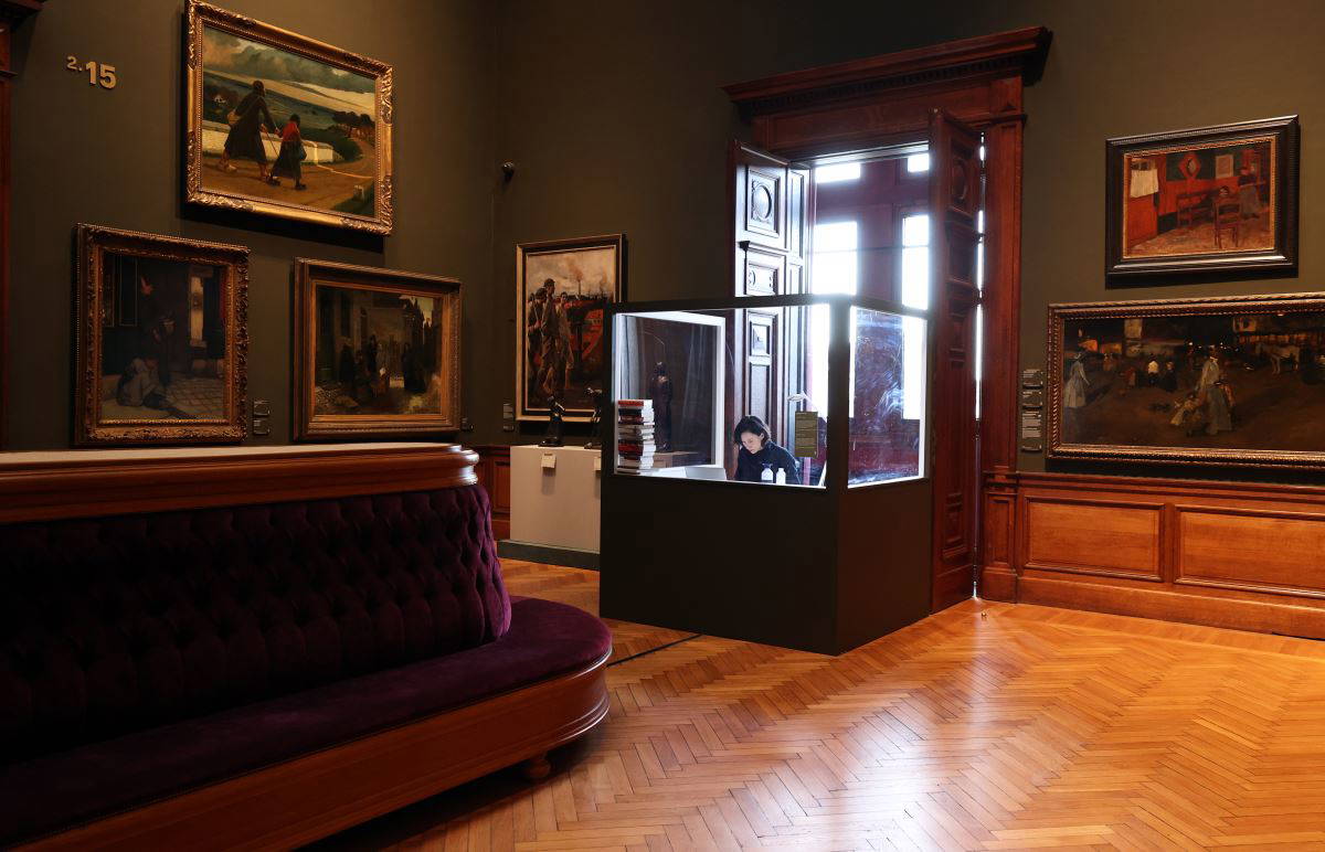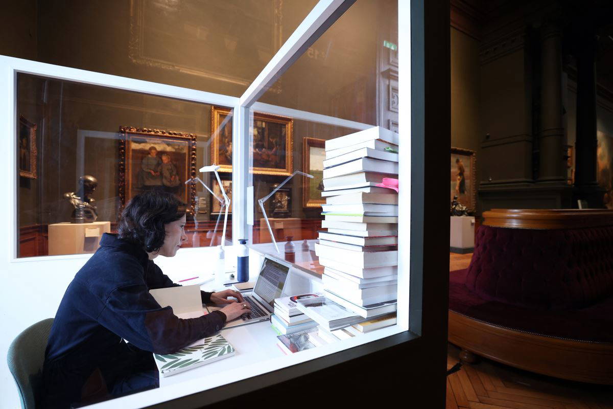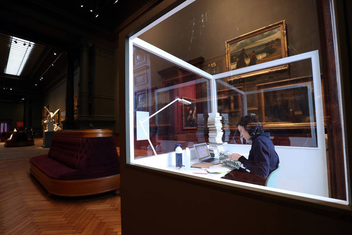 Belçika'nın Anvers kentindeki Kraliyet Güzel Sanatlar Müzesinde cam duvarlı 12 metrekarelik odaya yerleşen yazar Saskia De Coster, burada bir ay boyunca yeni kitabını tamamlamak için çalışacak.