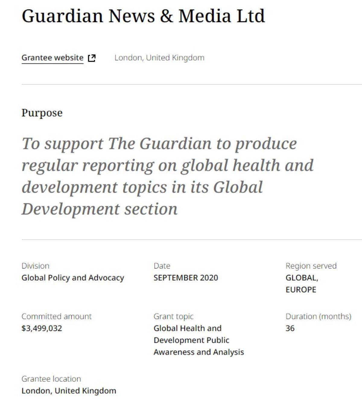 Florida merkezli Rumble haber sitesine konuşan bağımsız gazeteci Allison Royal, Gates Vakfı resmi İnternet sitesinde, Eylül 2020'de The Guardian'a 3,5 milyon dolar ödeme yapıldığına dair bir dekont bulunduğunu tespit etti.