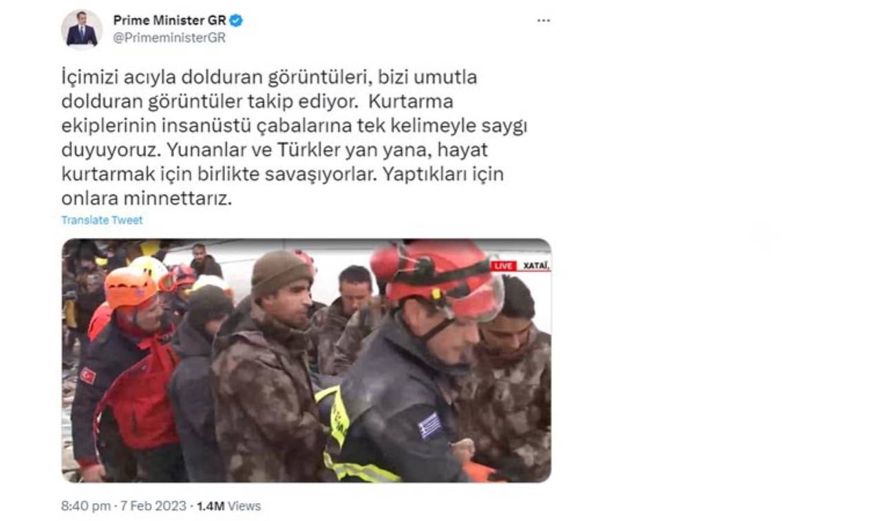 Miçotakis mesajında şu ifadelere yer vermişti: "Öncelikle Türkiye'de meydana gelen yıkıcı deprem dolayısıyla duyduğum derin üzüntüyü ifade etmek ve Yunanistan'ın Türkiye'ye ilk destek veren ülke olduğunu bir kez daha vurgulamak istiyorum. Anladığım kadarıyla Sivil Savunma Bakanı tarafından daha sonra ve daha ayrıntılı olarak bilgilendirileceğiz; Türk tarafı, kurtarma çalışmalarına yardımcı olacak EMAK afet müdahale gücünde bir uçağın gönderilmesini onaylamış durumda" dedi.