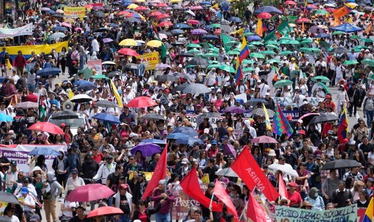 Kolombiya Eğitim Çalışanları Federasyonunun (Fecode) öncülük ettiği protestoya birçok kentten katılım sağlandı.