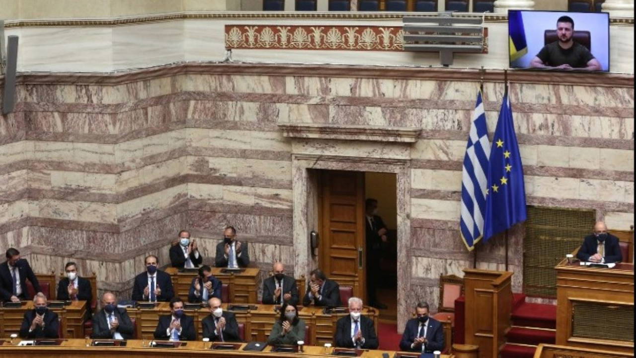 Zelensky görüntülü konuşmasını Yunanistan Cumhurbaşkanı Katerina Sakellaropulo, Başbakan Kriyakos Mitçotakis, ana muhalefetteki SYRIZA-İlerleme İttifakı lideri Aleksis Çipras, muhalefetteki Değişim Hareketi (KINAL) meclis grubu başkanı Mihalis Katrinis ve MeRA25 temsilcisi Yorgos Logiadis'in huzurunda yaptı.