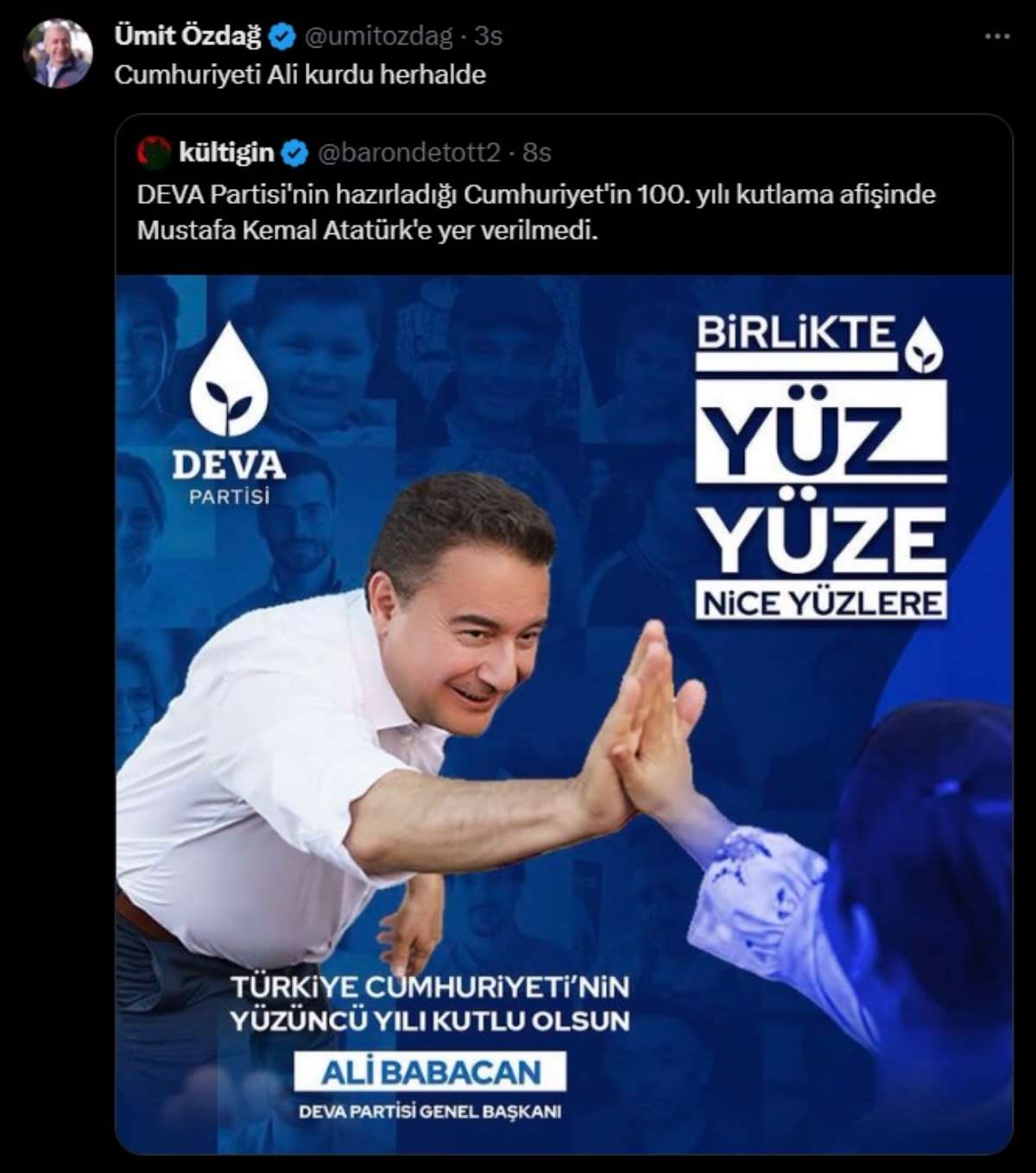 Türkiye, Cumhuriyetin 100. yaşını kutlamaya hazırlanırken; DEVA Partisi Genel Başkanı Ali Babacan'ın Cumhuriyetin 100. yılı için paylaştığı görsel sosyal medyada gündem oldu.