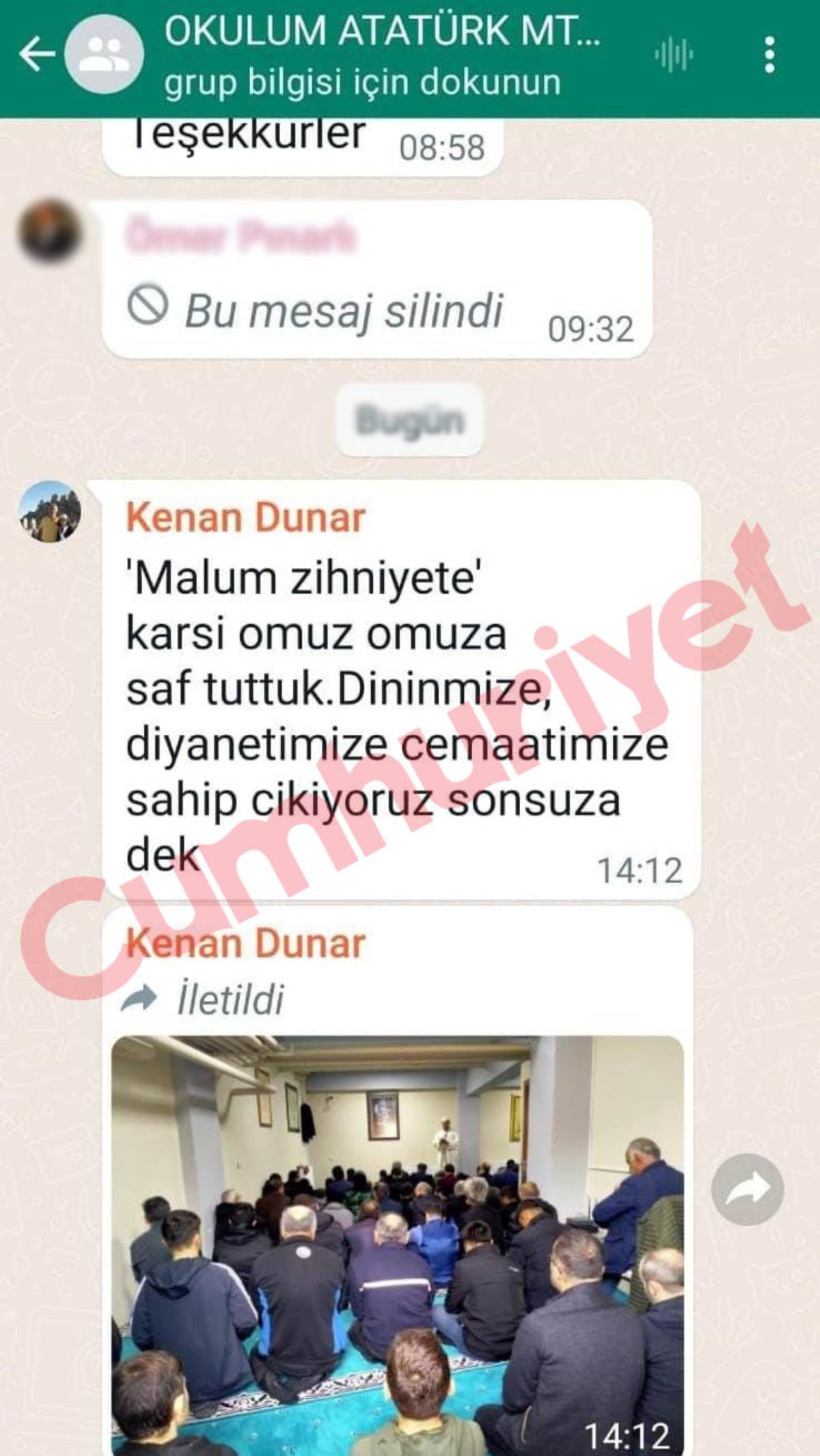 Cumhuriyet söz konusu yazışmalara ulaştı. Okulda topluca namaz kılan kişilerin fotoğrafını öğretmenlerin olduğu ve yalnızca yöneticilerin paylaşım hakkının olduğu grupta paylaşan müdür yardımcısı Dunar, “Malum zihniyete’ karşı omuz omuza. Dinimize, diyanetimize, cemaatimize sahip çıkıyoruz. Sonsuza dek” ifadeleri ile paylaştı. Bu paylaşımı ile de yetinmeyen Dunar, sabah töreni için toplanan öğrencilere şu ifadeleri kullandı: