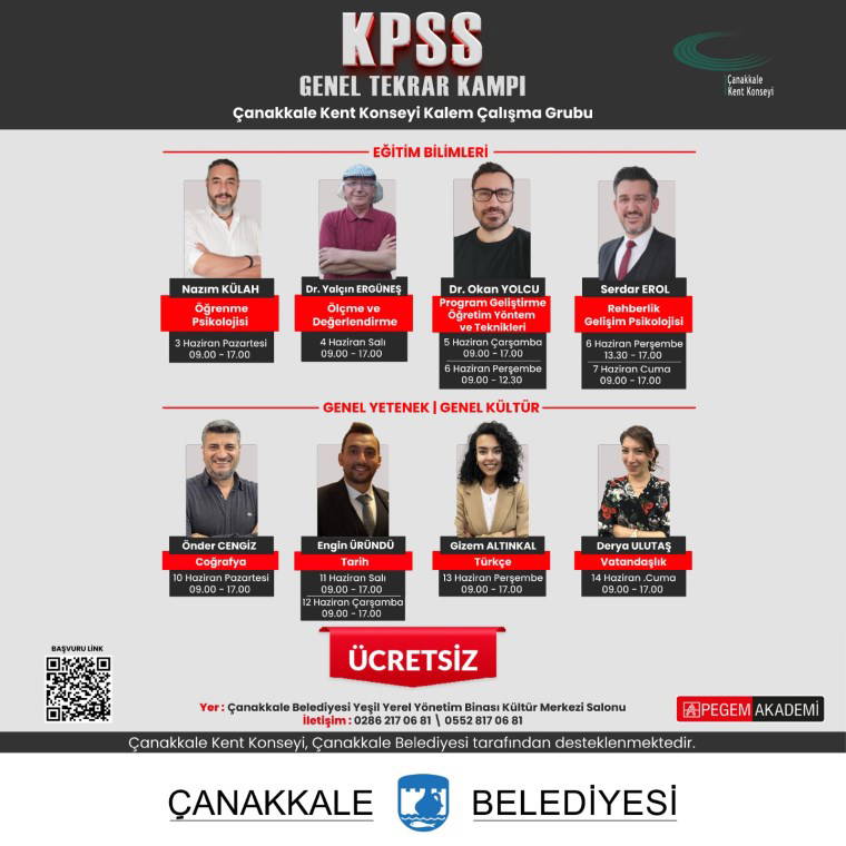 Çanakkale Belediyesi Yeşil Yerel Yönetim Binası Kültür Merkezinde 3 - 14 Haziran 2024 tarihleri ve 09.00 - 17.00 saatleri arasında gerçekleşecek olan Ücretsiz KPSS Genel Tekrar Kampındaki eğitimler, alanında uzman öğretmenler tarafından verilecek.