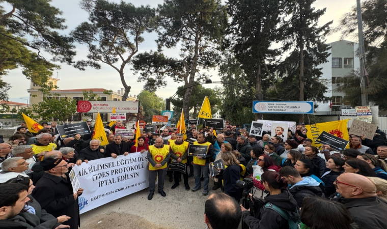 Eğitim Sen’in çağrısıyla Yeni Kuşak Köy Enstitülüler Derneği (YKKED), ÖV-DER ve CHP Bornova Kadın Kolları üyeleri Bornova İlçe Milli Müdürlüğü’nün önünde toplantı.