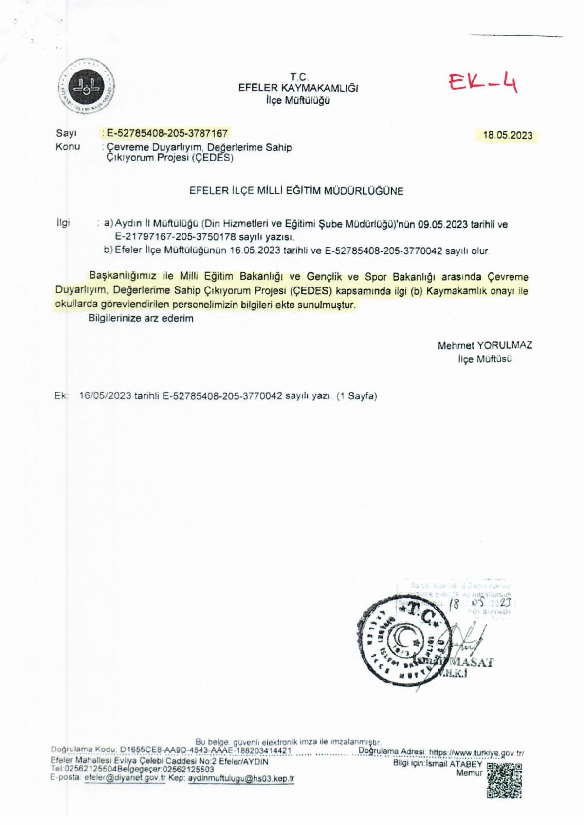 MEB Din Öğretimi Genel Müdürlüğü’nün resmi bilgilendirmesinden 2 ay önceye, 14 Mayıs seçimlerinden ise 1 gün sonraya denk gelen 15 Mayıs’ta, Aydın’da Efeler İlçe Müftüsü Mehmet Yorulmaz’ın imzasıyla kaymakamlığa gönderilen yazıda, ÇEDES Projesi kapsamında müftülüğün belirlediği din görevlilerinin, belirlenen okullarda görevlendirilmesi ve “görevlendirilen personelin söz konusu çalışmaları, asli görevlerini aksatmadan yapması” istendi.