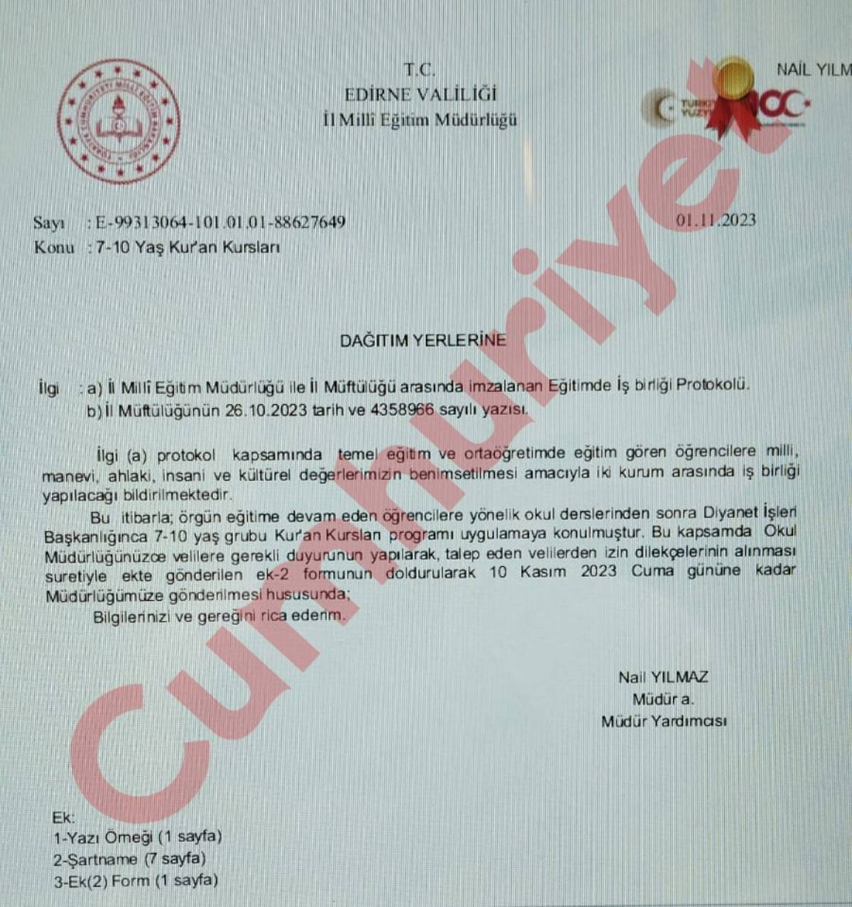 7-10 yaş grubunu kapsadığı belirtilen bu protokolde şu ifadeler yer verildi: “Örgün eğitime devam eden öğrencilere yönelik okul derslerinden sonra Diyanet İşleri Başkanlığı’nca 7-10 yaş grubu Kuran kursları programı uygulamaya konulmuştur. Bu kapsamda okul müdürlüğününüzce velilere gerekli duyurunun yapılarak, talep eden velilerden izin dilekçelerinin alınması ve formun doldurularak 10 Kasım 2023 Cuma gününe kadar müdürlüğümüze gönderilmesini rica ederim.”