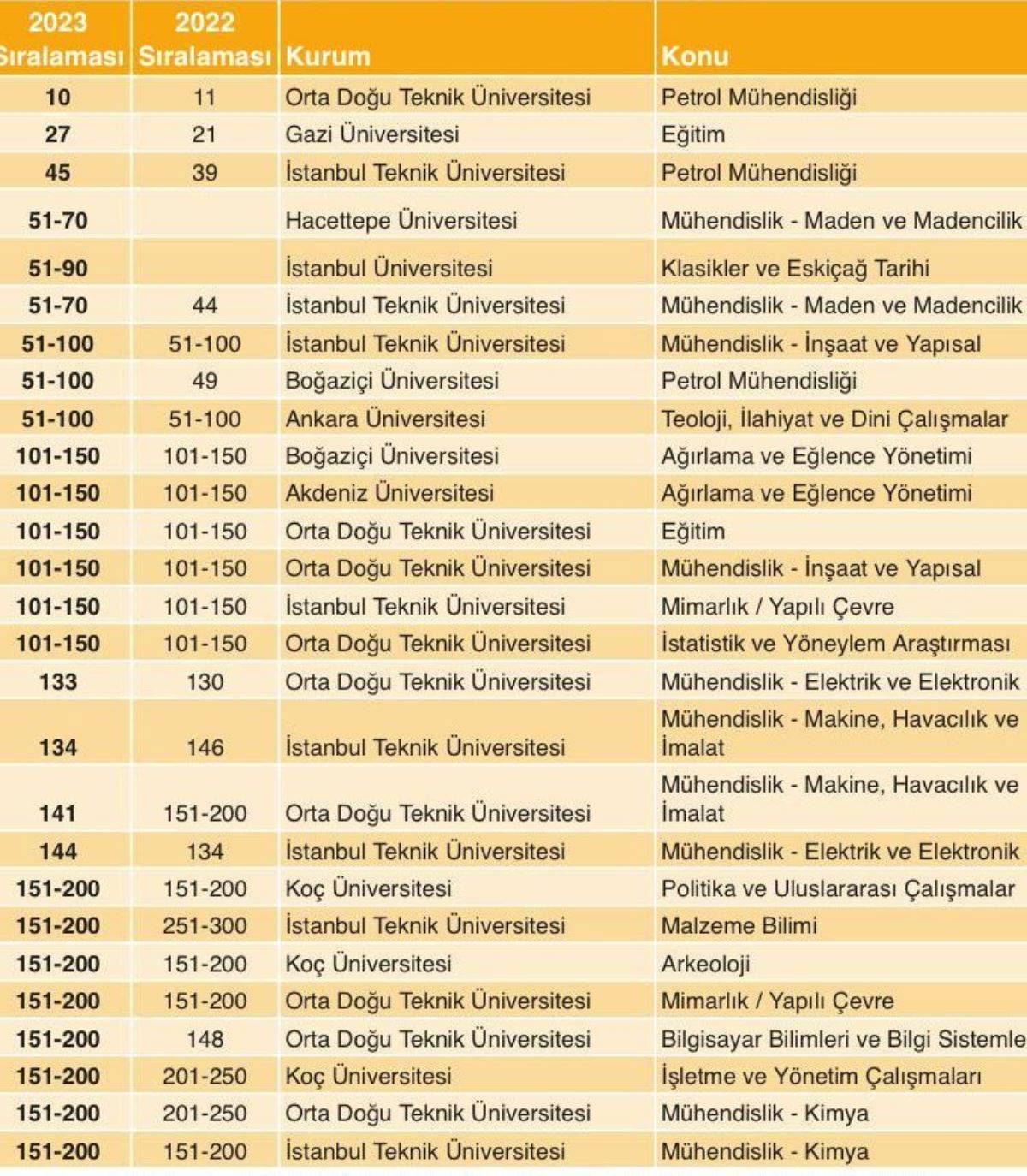 Yükseköğretim derecelendirme kuruluşu Quacquarelli Symonds (QS) “Konulara göre Dünya Üniversiteleri Sıralaması 2023”ü açıkladı. Sıralamada, 20 Türk üniversitesindeki çeşitli akademik disiplinlerdeki 133 programa ilişkin veriler bulunuyor. Bu programların 32'si gelişme göstermiş, 37'si gerilemiş, 54'ü ise yerini korumuş. Türkiye'den 10 programın ilk kez sıralamaya girdiği listede, ODTÜ 18 akademik disiplinle Türkiye'nin en iyi performans gösteren üniversitesi oldu, ODTÜ'yü 16 akademik disiplinle İstanbul Teknik Üniversitesi (İTÜ) izliyor. Boğaziçi Üniversitesi ve Koç Üniversitesi ise 15 akademik dalda sıralamada bulunuyor.