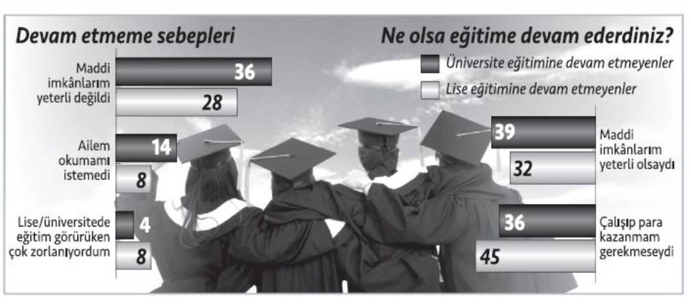 - Liseyi bırakanların yüzde 70’den fazlası, üniversite eğitimine devam edemeyenlerin yüzde 77’si, maddi koşulların farklı olması durumunda eğitimlerine devam edeceklerini söyledi.