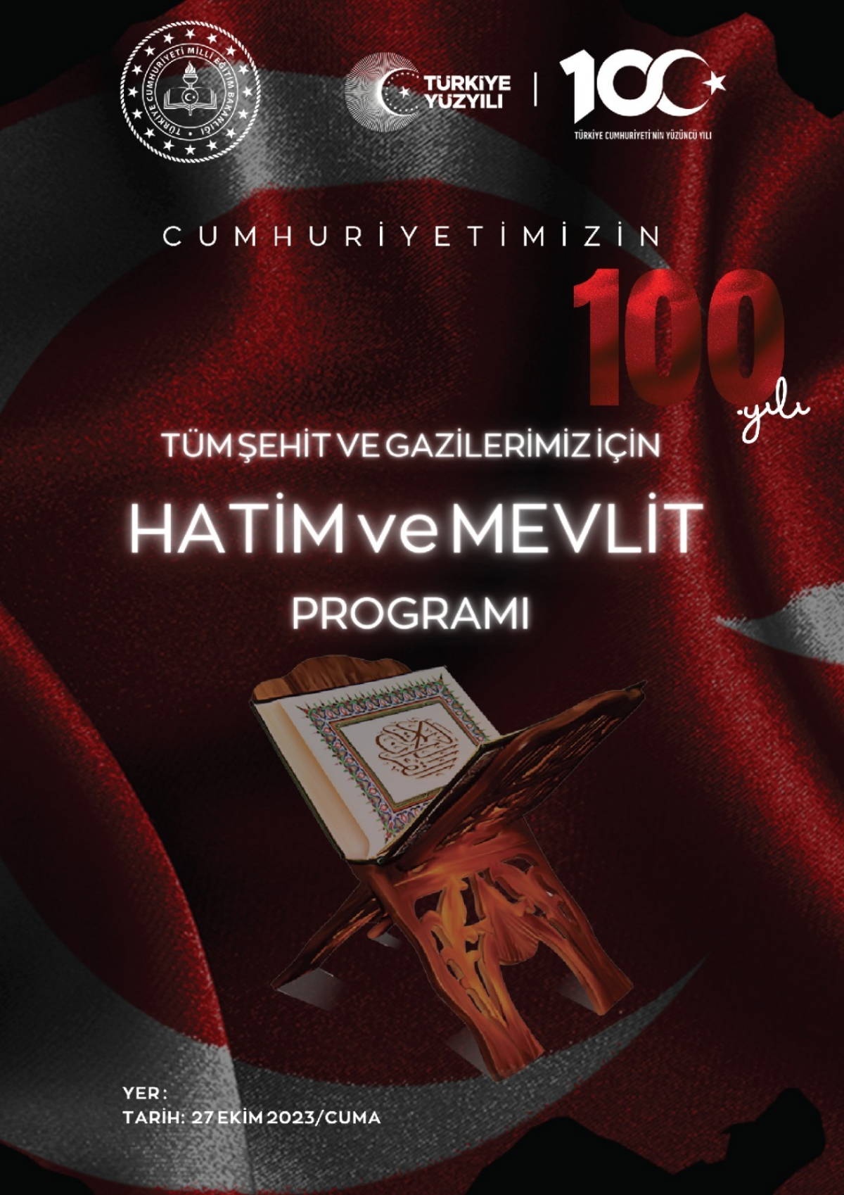 Milli Eğitim Bakanlığı’nın, Cumhurbaşkanı Recep Tayyip Erdoğan’ın “Çıkış trendi yakaladı” dediği imam hatip okullarıyla Cumhuriyetin 100. yılı için bir dizi kutlama etkinleri düzenlemesi dikkat çekti. Bu kapsamda MEB Din Öğretimi Genel Müdürlüğü tarafından, okullarda 27 Ekim Cuma günü uygulanması hedeflenen “Cumhuriyetimizin 100. Yılında Tüm Şehit ve Gazilerimiz İçin Anma, Hatim ve Mevlid” programı hazırlandı.