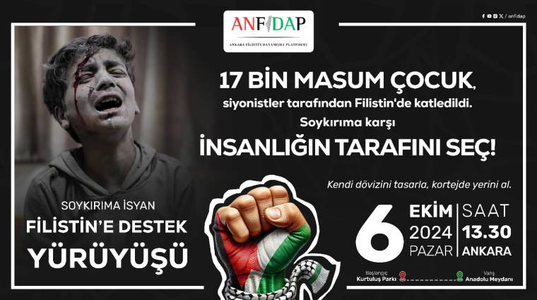 Bu bağlamda Ankara Vailiğinin izniyle 6 Ekim Pazar günü düzenlenecek "SOYKIRIMA İSYAN, FİLİSTİN'E DESTEK" yürüyüşünün Okul Müdürlerimiz aracılığıyla öğretmen, personel, öğrenci ve velilere duyurulması konusunda hassasiyet gösterilmesini bekliyoruz.