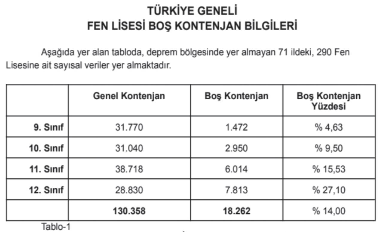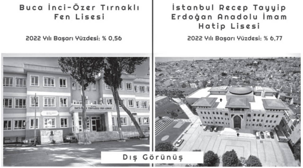Rapora göre, toplam 343 Fen lisesinin 151’i ilk yüzde 5’lik başarı diliminde yer alırken; 742 Anadolu imam hatip lisesinin (fen ve sosyal bilimler programı uygulayan) yalnızca 14’ü ilk yüzde 5’lik dilimde bulunuyor.