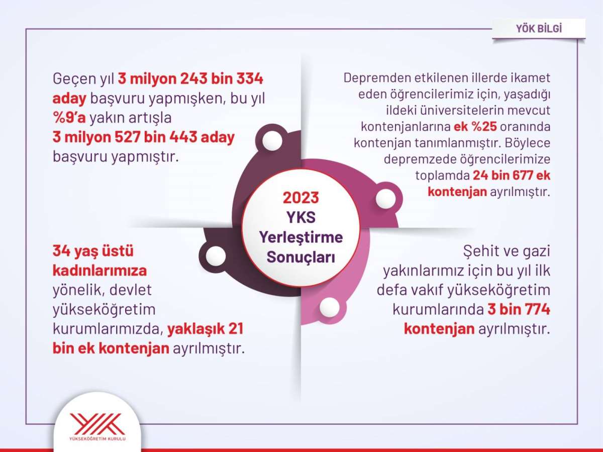 "2023 Yükseköğretim Kurumları Sınavı (2023-YKS) sonuçlarına göre adaylardan alınan tercihler doğrultusunda, 2023-YKS yükseköğretim programlarına merkezi yerleştirme işlemleri tamamlanmıştır.