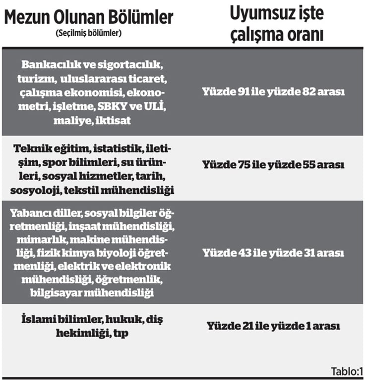 Cumhurbaşkanlığı İnsan Kaynakları Ofisi'nin Üni-Veri araştırması, durumun vahametini gözler önüne seriyor. Araştırmaya göre üniversite mezunlarının çoğunluğu mezun oldukları bölümlerle ilgisiz işlerde çalışıyor. Özellikle sosyal bilim bölümlerinden mezun olanların çalıştıkları işlerdeki uyumsuzluğu yüzde 90'lara ulaşıyor.