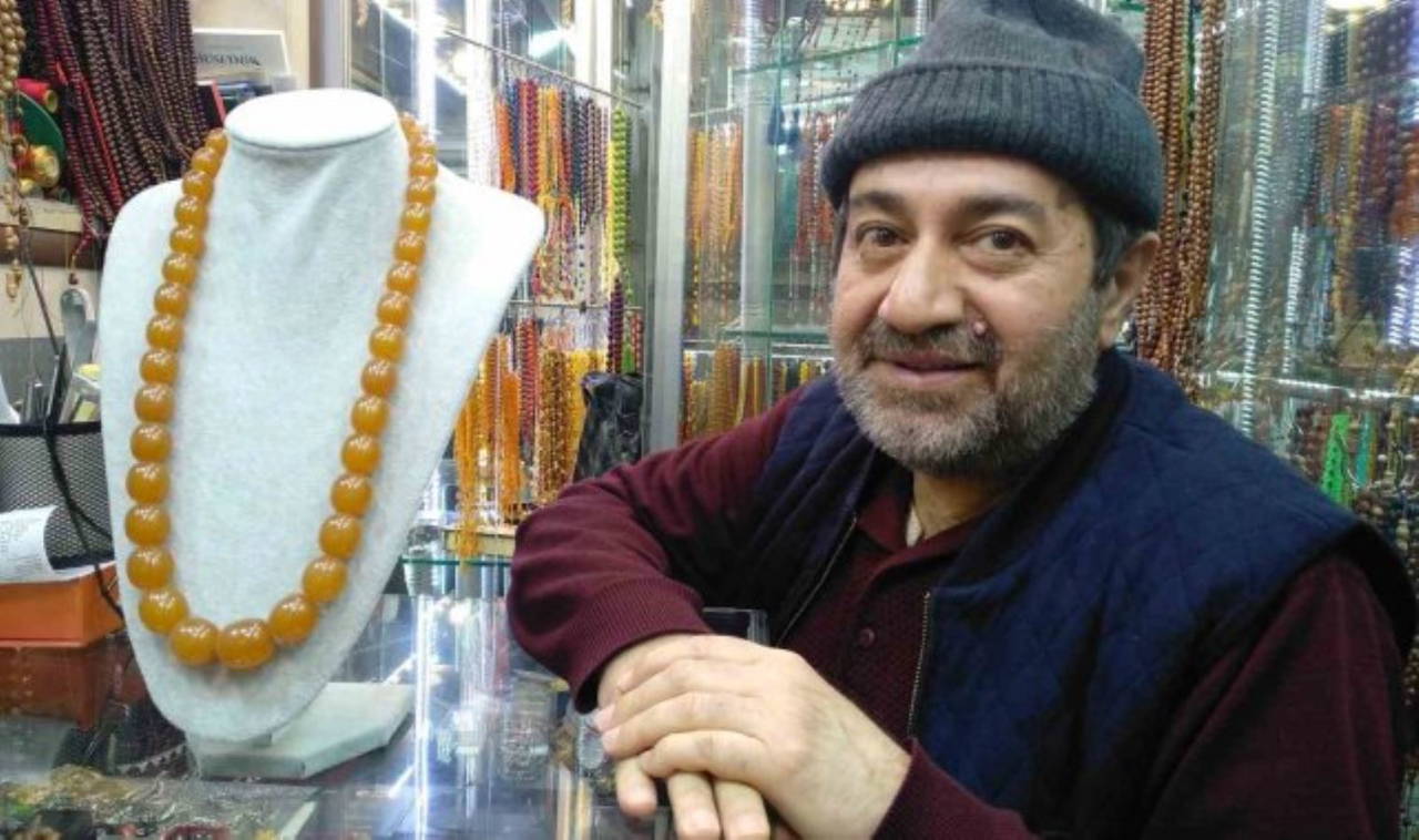 Elazığ'da tespih dükkanı işleten Mehmet Özen 200 yıl önce damla kehribarından yapılan at gerdanlığını dükkanında sergiliyor.