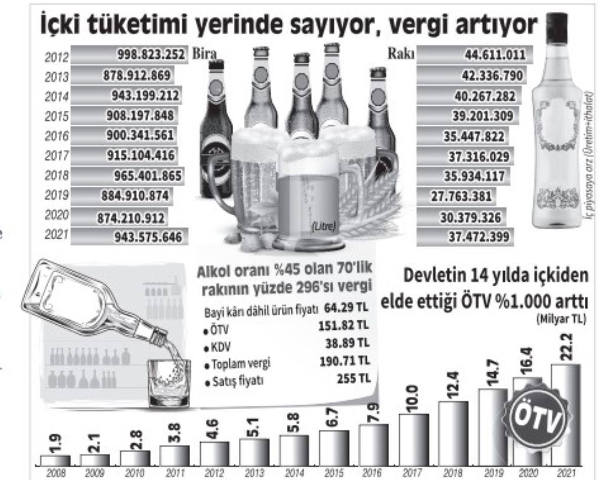 Her yıl ocak ve temmuz olmak üzere alkollü içkideki ÖTV iki kere zamlanıyor. Astronomik ÖTV artış oranları nedeniyle alkollü içkide evde üretim de artıyor. Son 14 yılda alkollü içkilerden devletin elde ettiği ÖTV geliri 116 milyar TL’yi aştı. 2021’de içkide devreye girmeyen ÖTV artışları kaçak ve sahte içki piyasasının önüne set çekmişti. ÖTV’nin devreye girmediği dönemde kaçak rakıda yüzde 40’lık bir düşüş oldu. Kayıtlı rakı miktarı 25 milyon litreden 30 milyon litreye çıktı. Kayıtsız kısmı ise 12 milyon litreden 7 milyona düştü. 2022 yılı başında alkollü içkiye yapılan yüzde 47.4’lük ÖTV zammının bu yıl yine kaçağı patlatması bekleniyor.