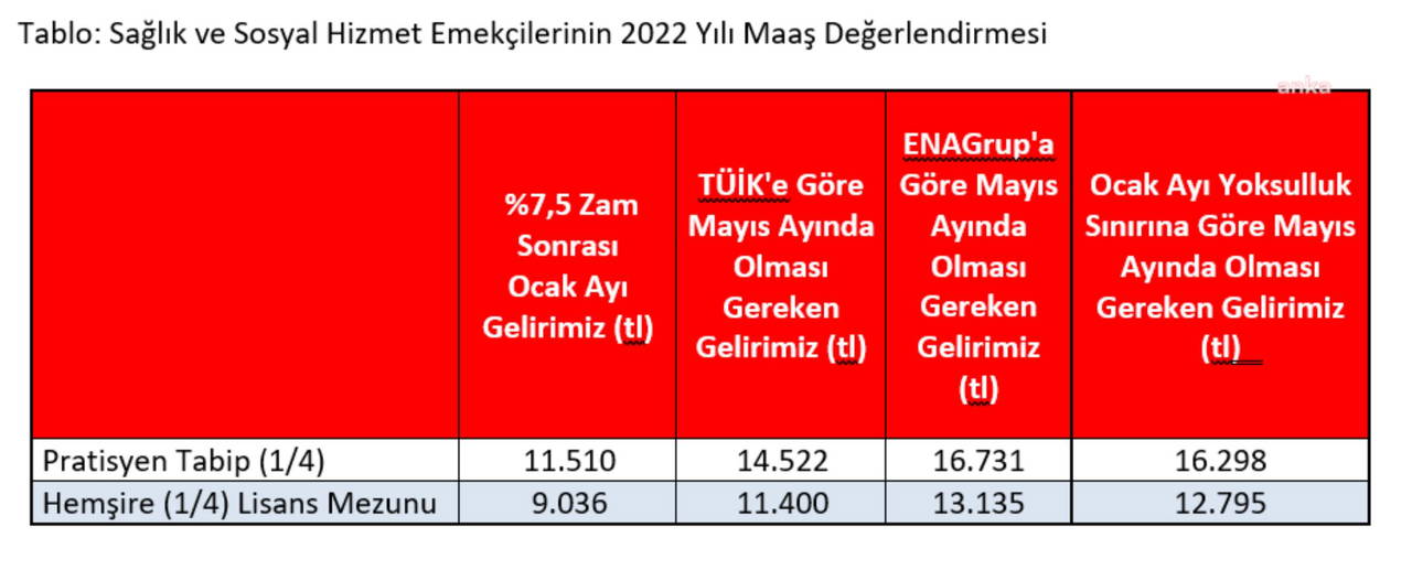 Sağlık emekçilerine aralık ayında, mart ayında ve mayıs ayında verilen iyileştirme sözlerinin tutulmaması nedeniyle 5 ay içinde gelirleri yoksulluk sınırının yarısına gerilemiştir. Pratisyen hekimin gelirinin yoksulluk sınırı karşısında oranı, ocaktan mayıs ayına yüzde 83’ten yüzde 59’a düşmüştür. Hemşirenin ise aynı dönemde geliri yüzde 65’ten yüzde 46’ya gerilemiştir.