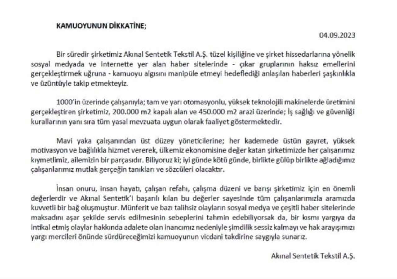 Konuyla ilgili yapılan haberlerin ‘manipületif’ olduğuna vurgu yapılan açıklamada, “Şirketimiz, iş sağlığı ve güvenliği kurallarının yanı sıra tüm yasal mevzuata uygun olarak faaliyet göstermektedir. Mavi yaka çalışanından üst düzey yöneticilerine; her kademede üstün gayret, yüksek motivasyon ve bağlılıkla hizmet vererek, ülkemiz ekonomisine değer katan şirketimizde her çalışanımız kıymetlimiz ailemizin bir parçasıdır” ifadeleri yer aldı.