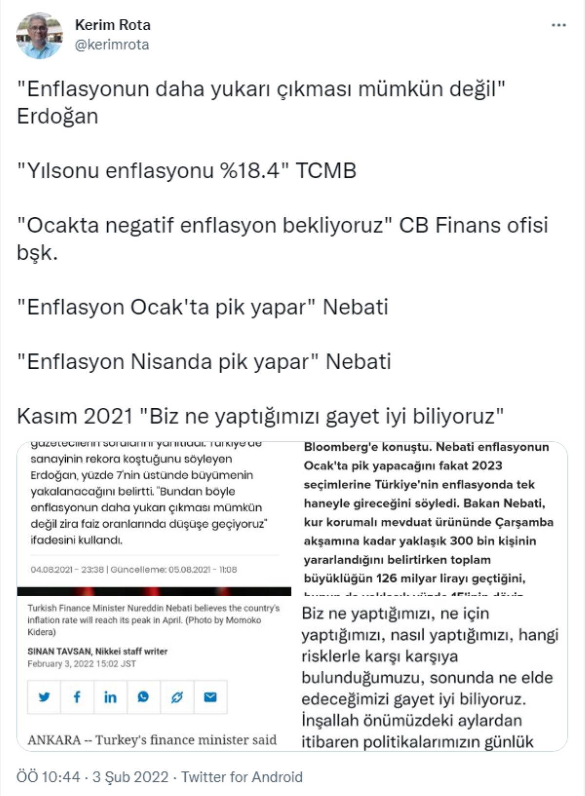 Kurun bu seviyelerde devam ettiği ortamda fiyat düzeltmelerinin etkisiyle ocak ayında eksi enflasyon bekliyorum. Tasarruf sahipleri ocaktaki negatif enflasyonu da dikkate almasınlar, o da baz etkisiyle olacaktır. Şubattan sonraki enflasyon önümüzdeki döneme dair enflasyon beklentisini belirleyecek dönem olacak'' demişti.