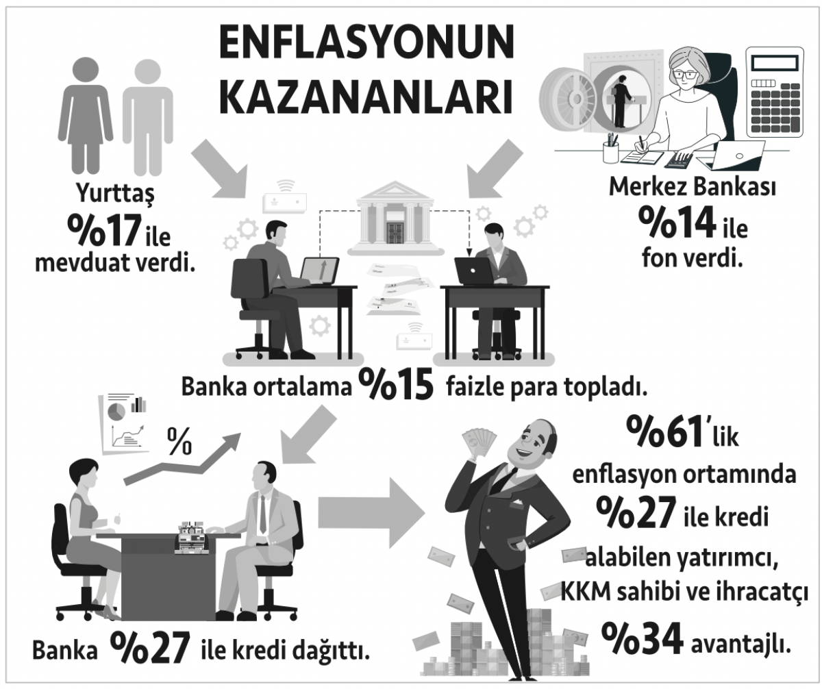Bankaların TL ile verdikleri kredilerin de Merkez Bankası’nda karşılıkları olduğunu hatırlatan Prof. Dr. Duran Bülbül, “Finans sektörü yüzde 14 ile para toplayıp yüzde 27 ile satıyor, finans sektörünün müthiş kârı var. Kredi çekebilenler de çok güzel kâr ediyor. Çünkü resmi enflasyon yüzde 61, gerçek enflasyonun yüzde 150 olduğu bir ortamda yüzde 27 faizle para alabiliyorlar. Bunlar bir de gayrimenkul alıyor, ticaret için mal alıyor ve onlar da enflasyonla birlikte değerleniyor. Paradan para kazanılıyor. Yurttaş, TL mevduatta tuttuğu para ile zenginlere ucuz para satmış oluyor. İktidar da piyasayı ucuz krediye boğarak seçime hazırlık yapmış oluyor” dedi.