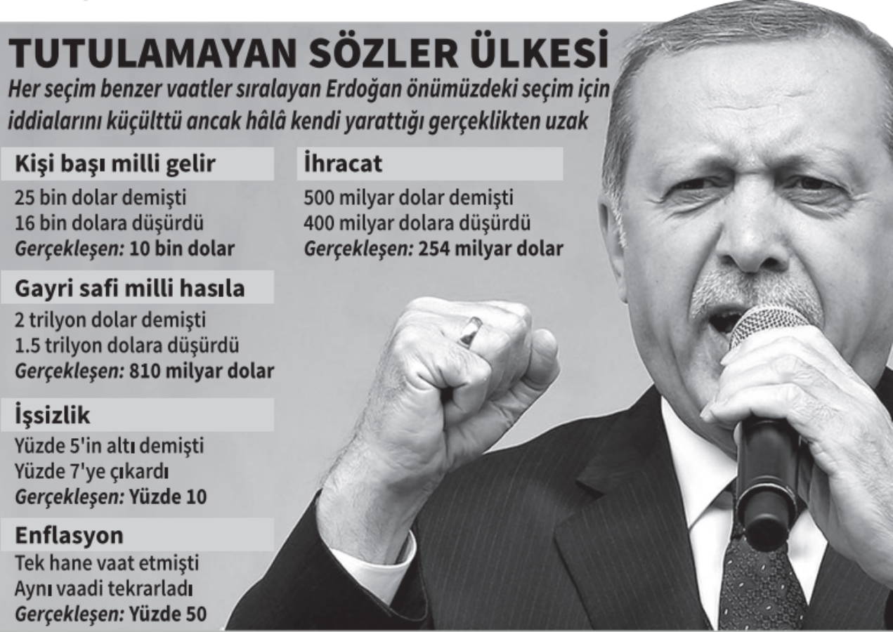 AKP seçim beyannamesinde yer alan ekonomik programını açıklayarak 21 yıldır gerçekleştiremediklerini bir kez daha vaat olarak sıraladı. İşsizliğin yüzde 10’a çıktığı, enflasyonun yüzde 50’lerde olduğu, cari açığın rekorlar kırdığı, dövizin baskıya rağmen 19.3’e tırmandığı ortamda açıklanan yeni vaatler ise ilan edilen orta vadeli programla (OVP) da çelişiyor.