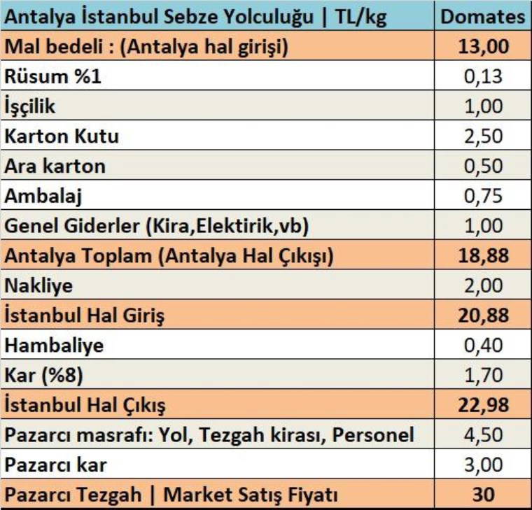 Antalya Ticaret Borsası ise İstanbullu vatandaşların tepki gösterdiği market fiyatlarının anlaşılır kılınması içi domates özelinde bir çalışma hazırladı. Bu çalışmada halden 13 liraya çıkan domatesin nasıl iki katından fazla bir fiyata ulaştığı, İstanbul ‘da market rafına ulaşana kadar geçtiği aşamalar sıralanarak anlatılıyor.