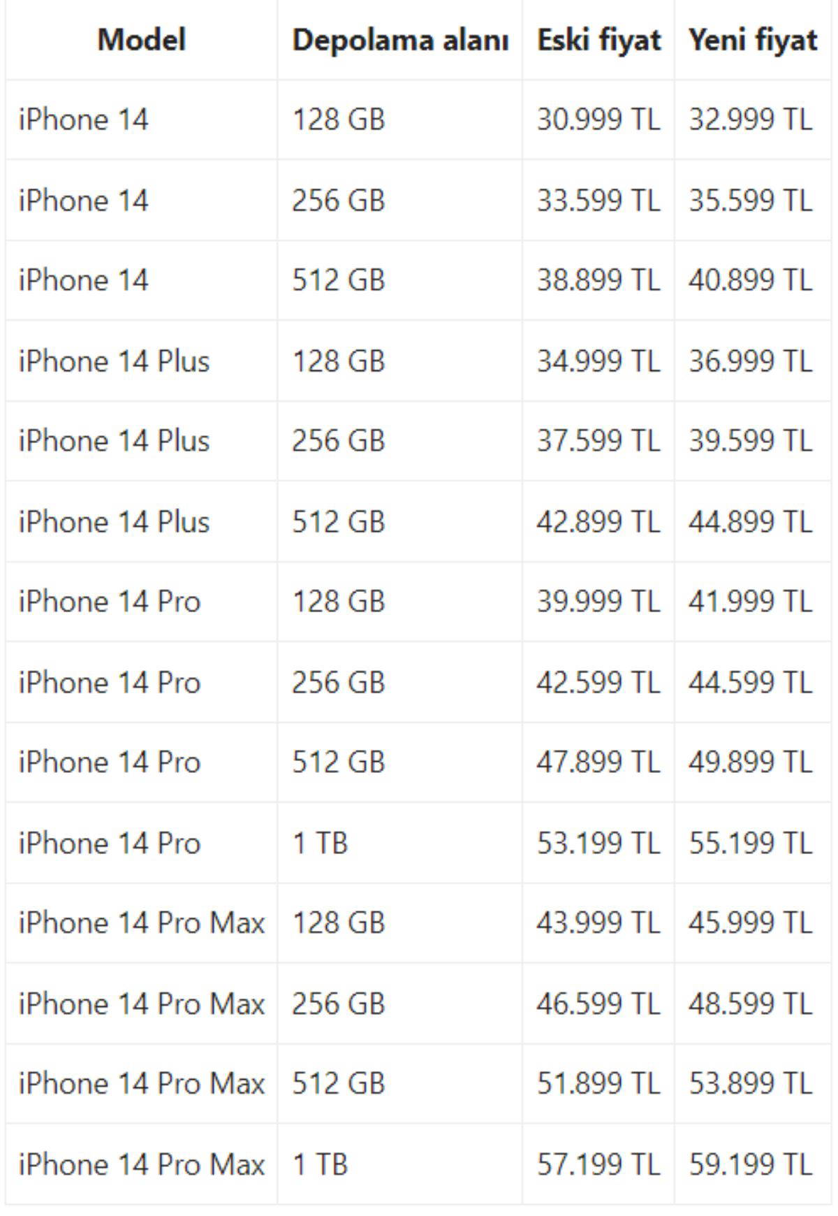 Webtekno'dan Ümit Kılıç'ın aktardığına göre, Apple, iPhone 14 fiyatlarına zam yaptı. Öte yandan iPhone 13 ve önceki serilerin fiyatlarında değişim yapılmadı.