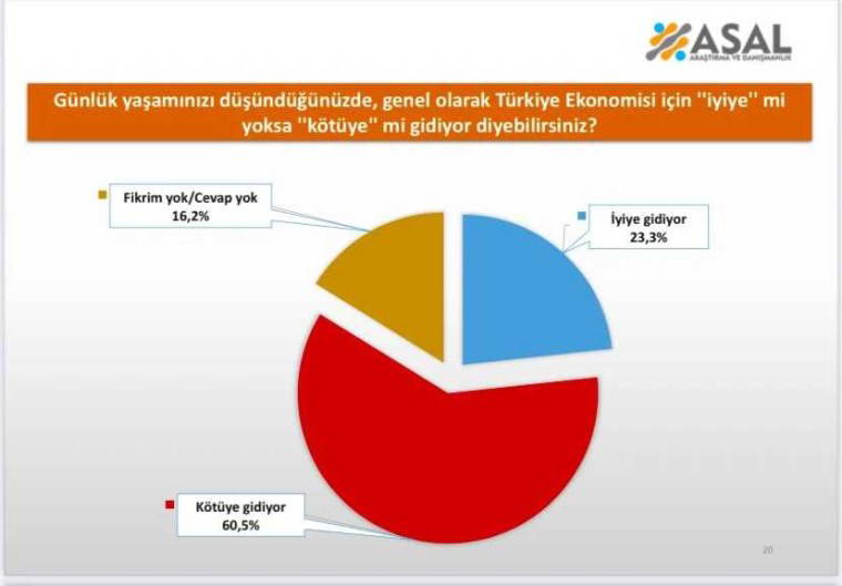 Bir diğer ankette katılımcılara, “Günlük yaşamınızı düşündüğünüzde, genel olarak Türkiye ekonomisi için 'iyiye' mi yoksa 'kötüye' mi gidiyor diyebilirsiniz?” sorusu soruldu. Alınan yanıtlara göre oranlar şu şekilde: