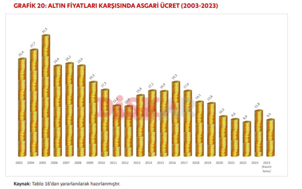 2003 yılında yıllık ortalama tam altın 121 lirayken asgari ücret yıllık ortalama 3 bin 72 liraydı ve asgari ücretli 25,4 tam altın alabiliyordu.