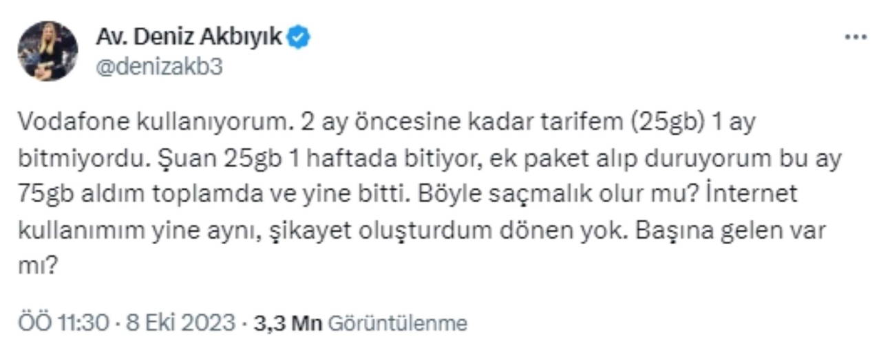 İşte avukatın o tweeti; “Vodafone kullanıyorum. 2 ay öncesine kadar tarifem (25gb) 1 ay bitmiyordu. Şu an 25 gb 1 haftada bitiyor, ek paket alıp duruyorum bu ay 75 gb aldım toplamda ve yine bitti. Böyle saçmalık olur mu? İnternet kullanımım yine aynı, şikayet oluşturdum dönen yok. Başına gelen var mı”