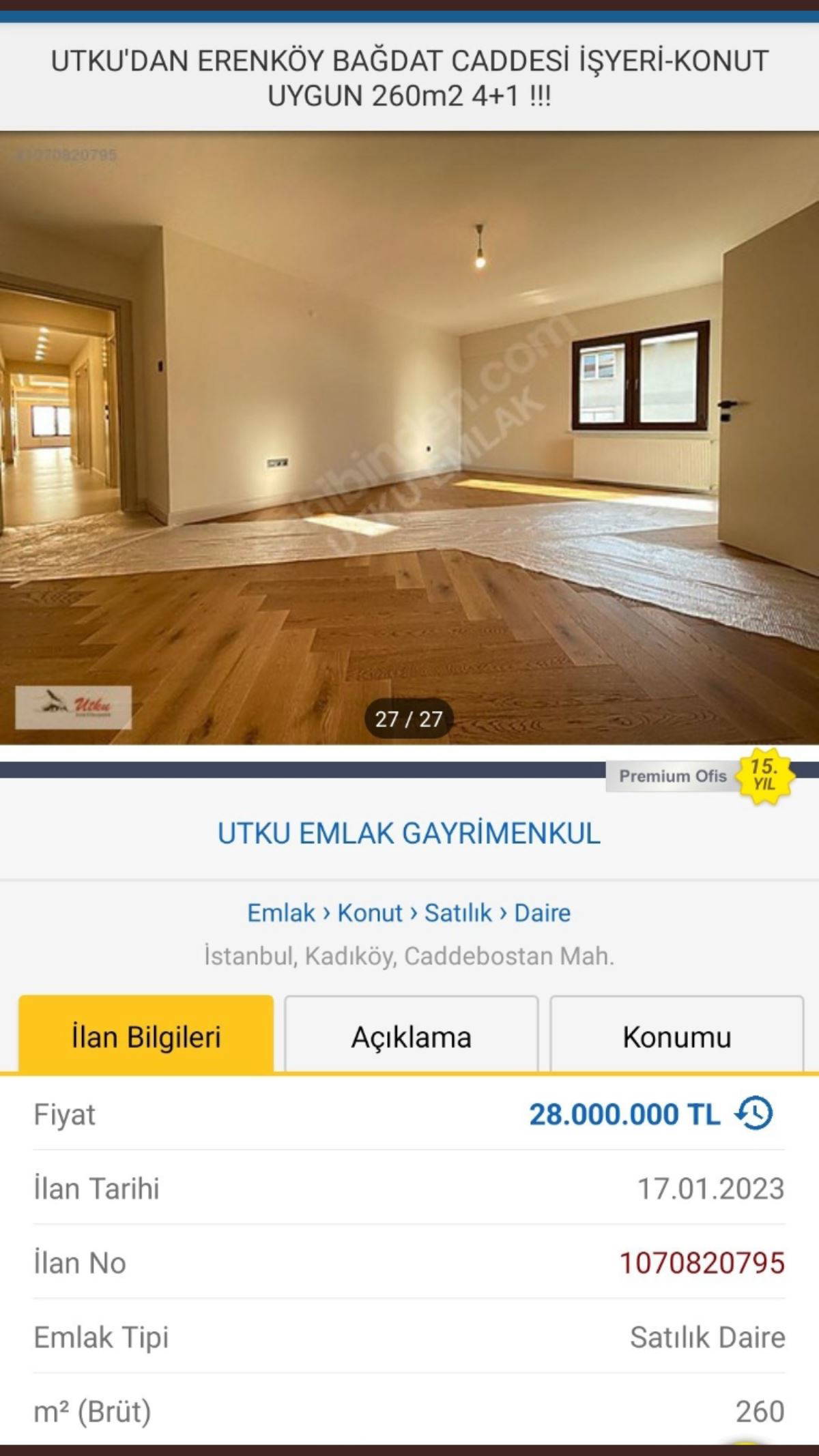 Örneğin satılık ilanı verilen Erenköy’de Bağdat caddesine yakın 280 metrekarelik kullanım alanı bulunan 4.5 odalı bir salona sahip dairenin fiyatı 28 milyon lira.
