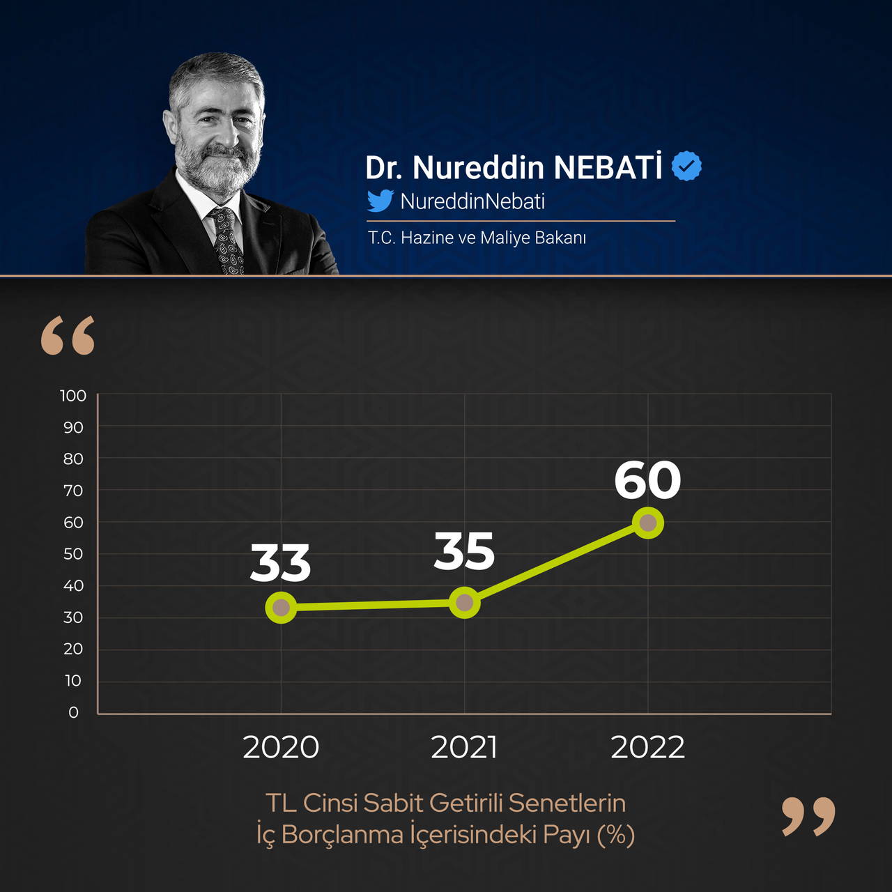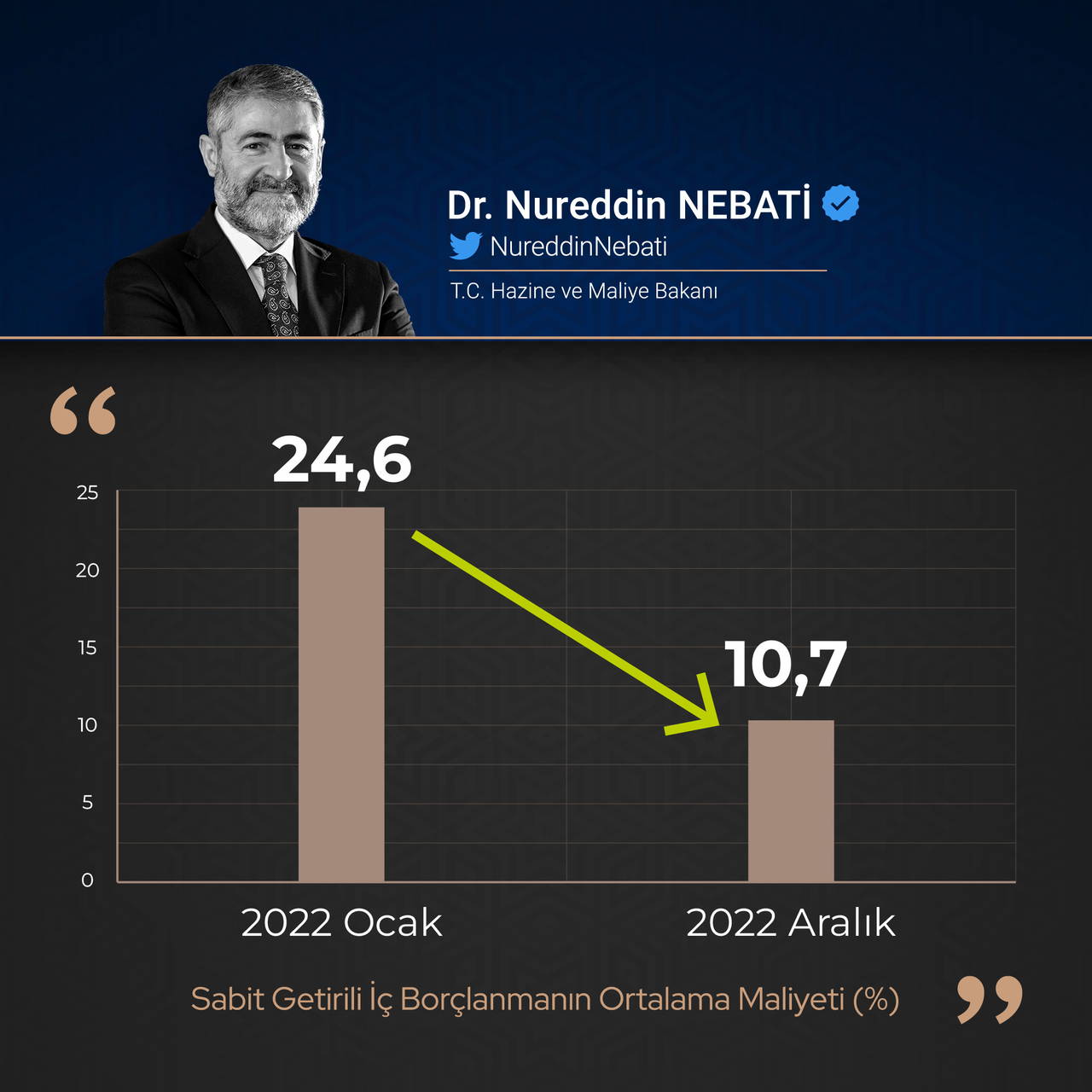 "2022 yılı Temmuz ayında Hazine tarihinin en uzun aylık ortalama borçlanma vadesi olan 98 aya ulaştık. 2022 yılı başında yüzde 24,6 seviyesinde olan sabit getirili iç borçlanmamızın ortalama maliyeti 2022 yılı aralık ayı sonu itibarıyla yüzde 10,7 seviyesine geriledi. TL cinsi sabit getirili senetlerimizin toplam iç borçlanmamız içerisindeki payı da 2021'de yüzde 35 seviyesinde iken, 2022 sonunda yüzde 60'a ulaşarak borç stoğumuzun kompozisyonunu ciddi biçimde güçlendirdi."
