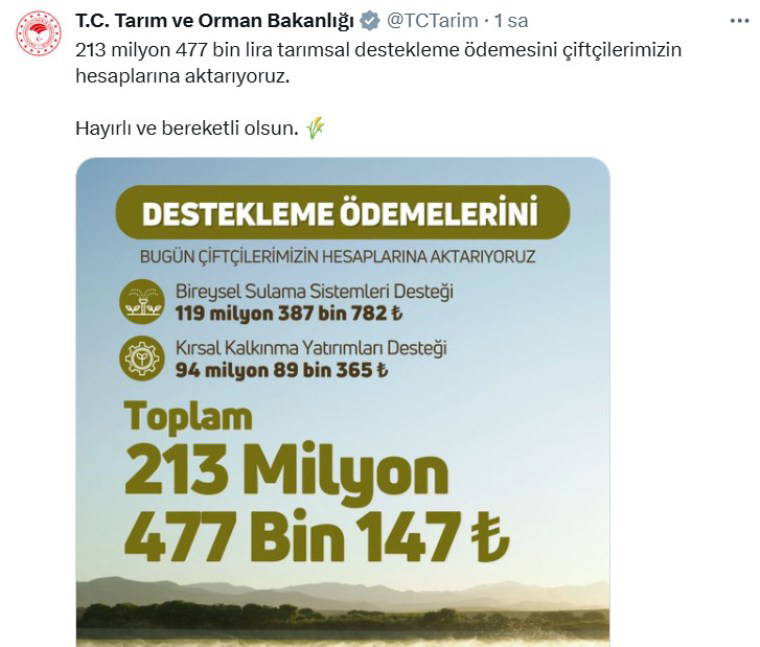 Bakanlığın, sosyal medya hesabı X'ten, tarımsal destekleme ödemelerine ilişkin açıklama yapıldı.