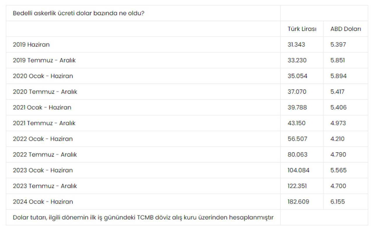 Habertürk'ten Ahmet Kıvanç'ın aktardığına göre, bedelli askerliğin kalıcı hale getirildiği 2019 yılı haziran ayında bedelli askerlik ücreti 31.343 TL idi ve 5.397 dolara karşılık geliyordu. Bedelli askerlik ücreti temmuz ayında 5.851 dolara, 2020 yılı ocak ayında ise 5.894 dolara yükseldi. İzleyen dönemlerde düşmeye başladı ve 2020 temmuz ayında 5.417 dolara, 2021 ocak ayında 5.406 dolara, temmuz ayında 4.973 dolara, 2022 ocak ayında 4.210 dolara gerileyerek dip seviyeyi gördü. 2022 temmuz ayında 4.790 dolar, 2023 ocak ayında 5.565 dolar, temmuz ayında 4.700 dolar oldu. Bu yılın ocak ayında ise 6.155 dolar ile dolar bazında beş yılın en yüksek seviyesine çıktı.