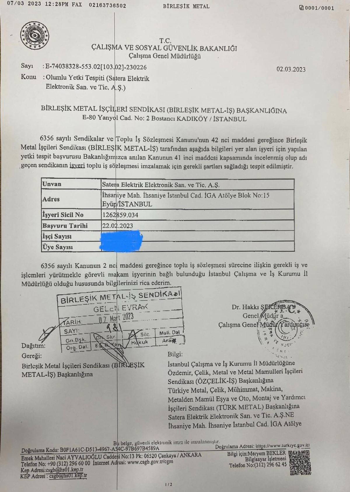 Sendikanın yaptığı açıklamada, “İşçilerin neredeyse tamamının sendikamıza üye olmasının ardından yasanın aradığı çoğunluğu sağlayan sendikamız Çalışma ve Sosyal Güvenlik Bakanlığı’na yetki başvurusunda bulundu. Bakanlık yaptığımız başvuruyla ilgili incelemeyi tamamladı ve sendikamızın işyerinde yetkili olduğunu tescil etti” ifadeleri yer aldı. Şirket yetkililerinin çalışan işçileri tek tek görüşmeye çağırıp sendikadan istifa etmeye zorladığı belirtilen açıklamada “İşten çıkarma ve baskı altında bırakılan üyelerimiz sendikal haklarının bilincinde davranıyor ve direniyor” ifadeleri yer aldı.