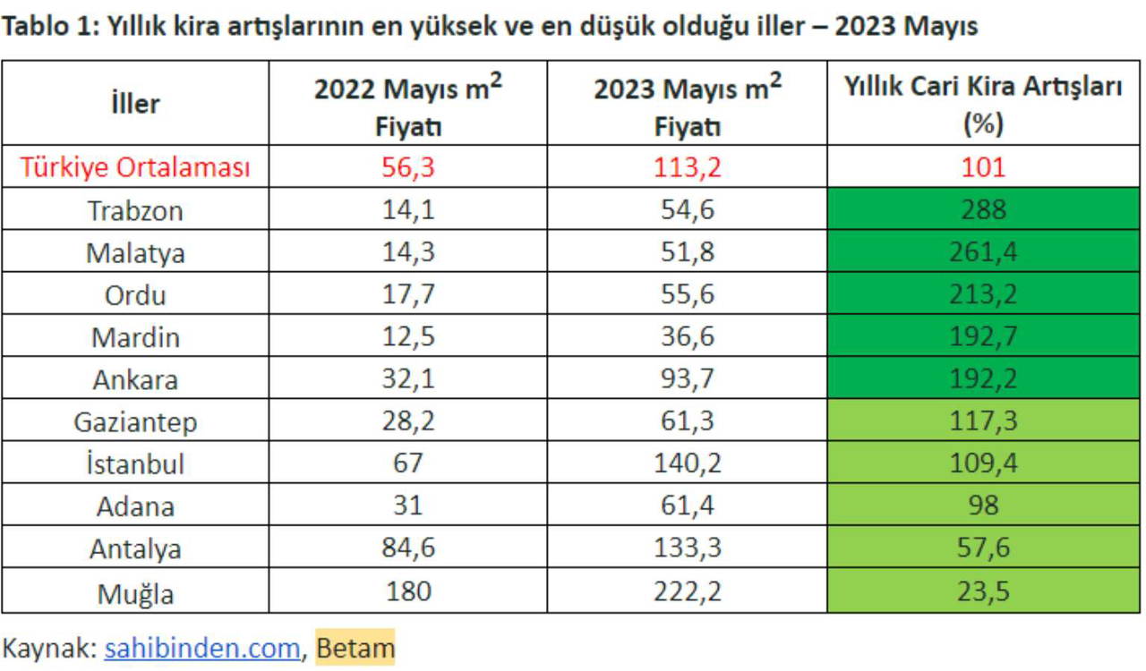 Yıllık kira artış oranı İstanbul'da yüzde 109,4, Ankara'da yüzde 192,2, İzmir'de ise yüzde 150 olarak öne çıktı.