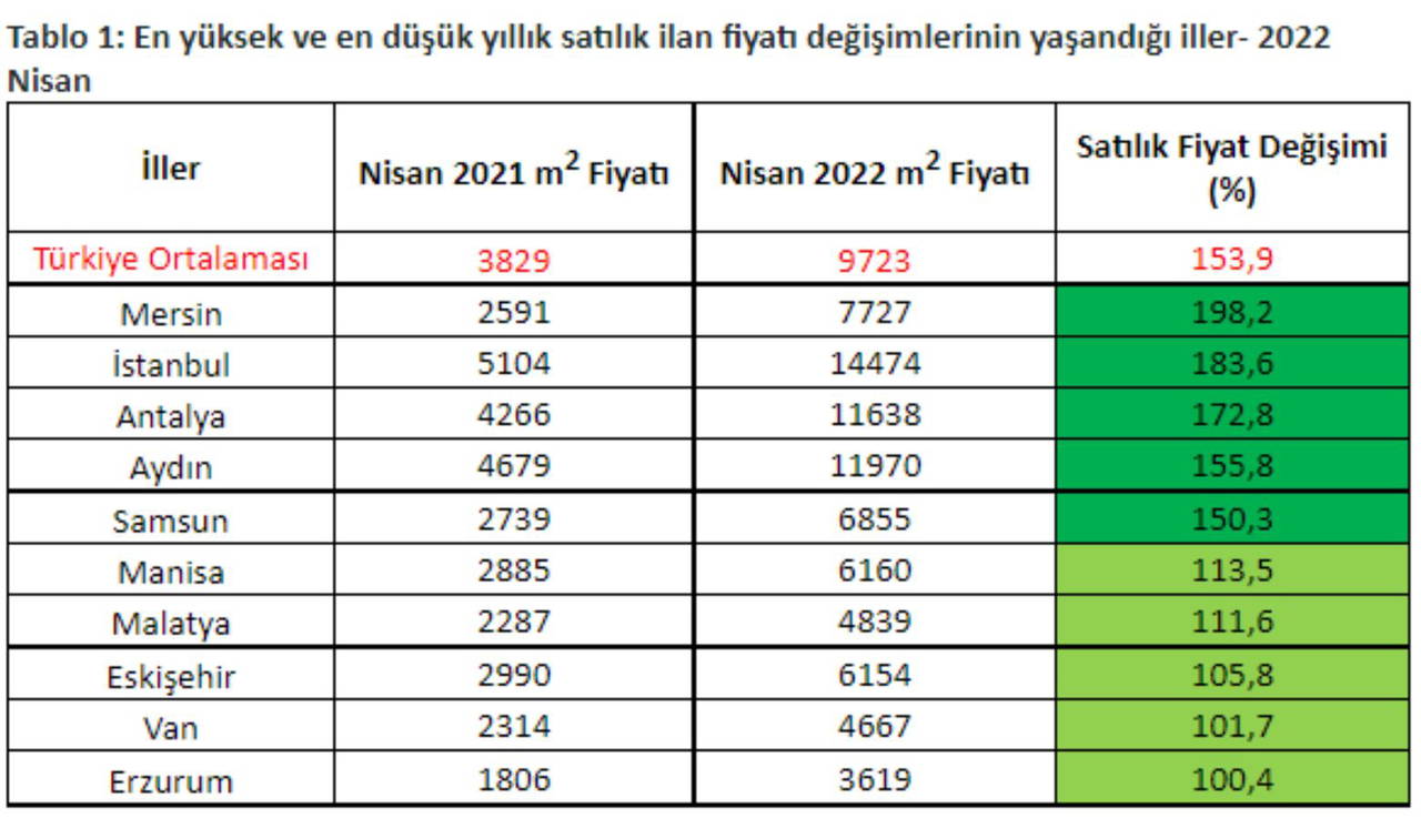 Buna göre, mart ayında 15 puan yükselen fiyat artış oranı nisan ayında 19,6 puan yükseldi. Ülke genelinde ortalama satılık konut ilan metrekare cari fiyatı 2022 Nisan’da bir önceki yılın aynı ayına göre yüzde 153,9 artarak 9 bin 723 TL’ye çıktı.