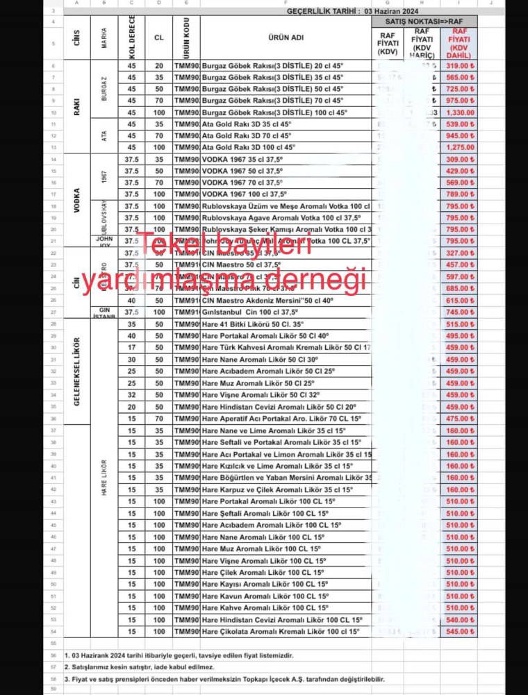 Tekel Bayileri Yardımlaşma Derneği Başkanı Erol Dündar, yeni fiyat listesini sosyal medya üzerinden paylaştı.