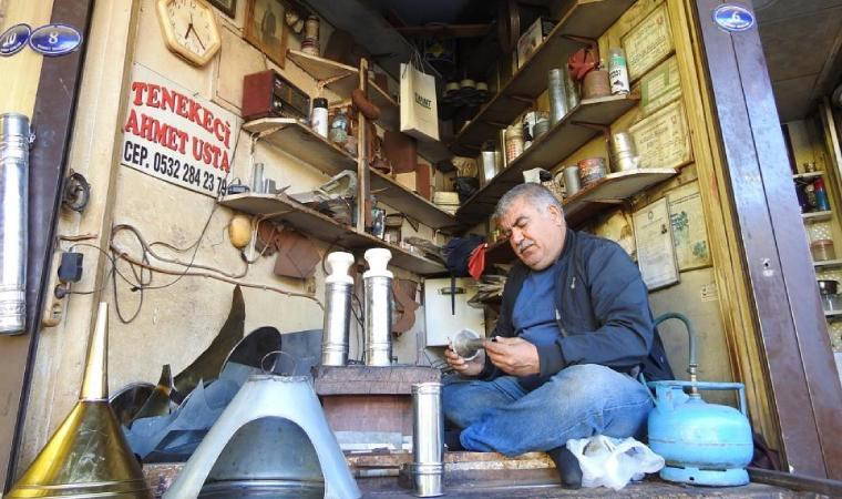 Gaziantep’te yaşayan Ahmet Telefoncu, yarım asırdır dedesinden babasına, babasından da kendisine kalan tenekecilik mesleğini bir buçuk metrekarelik dükkanında sürdürüyor.