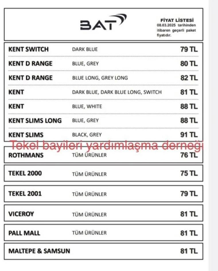 Bugünden (8 Mart 2025) itibaren geçerli olacak yeni fiyat listesine göre sigara fiyatları 75 TL ila 91 TL arasında değişecek.